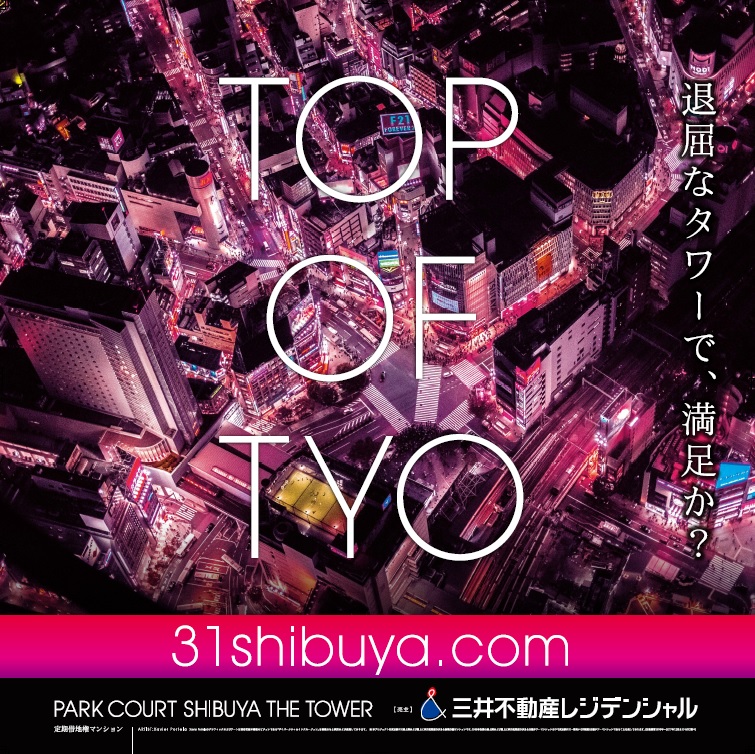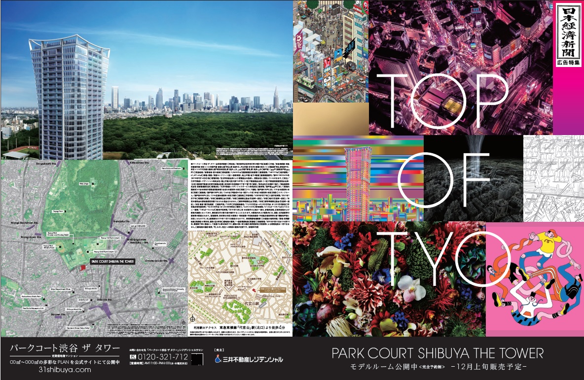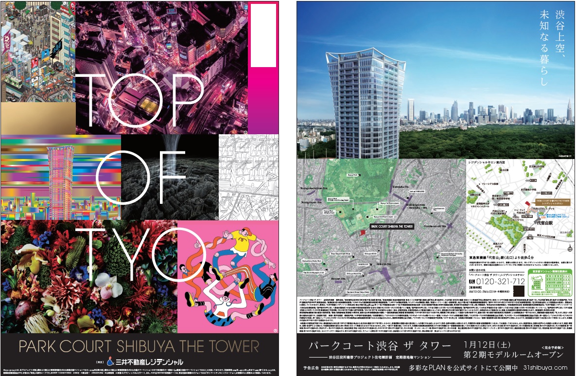 渋谷区役所立替プロジェクトの住宅部分の計画として、NHKや代々木公園の目の前の一等地に建つ三井不動産レジデンシャルの高級マンションプロジェクト。グラフィックのデザイン部分を担当しました。TOP OF TYOというキャッチコピーや新進気鋭のアーチストの作品を組み合わせ、日本の最先端にしていまもなお進化し続ける渋谷の最高峰の物件であることをアピールしました。