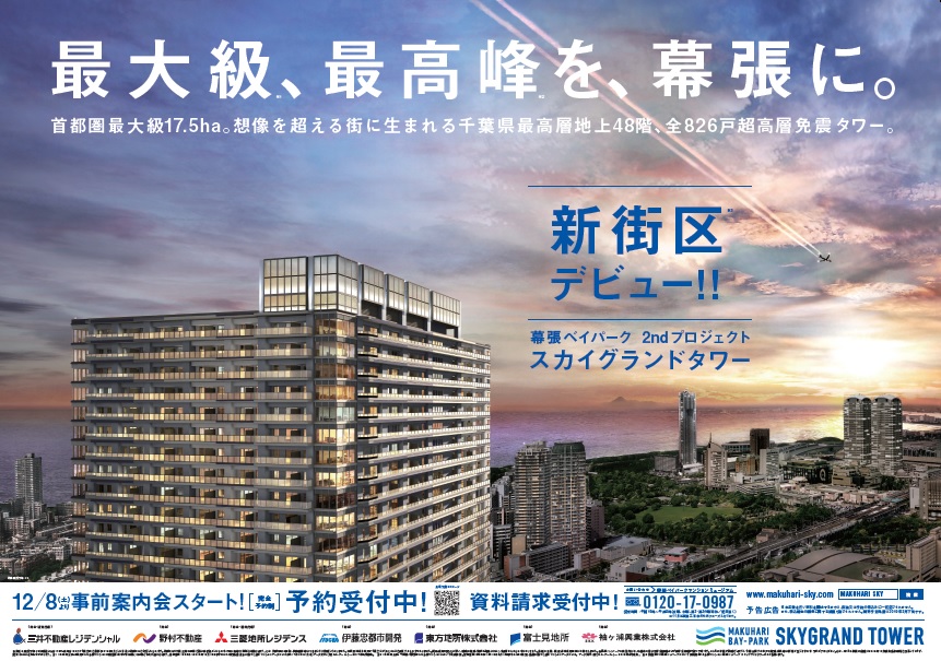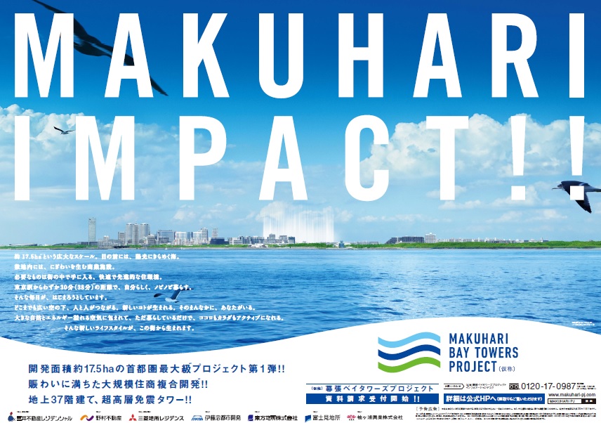 JR京葉線海浜幕張駅周辺に幕張ベイタウン以来20年以上の時を経て誕生する「幕張ベイパーク」。このタワーマンション6棟を含む約4,500世帯が居住する首都圏最大級のタワーマンションのグラフィックを担当しました。首都圏最大級の開発面積、千葉県最高峰の超高層タワー、商住一体開発を柱とした、堂々とした表現で広告展開しました。