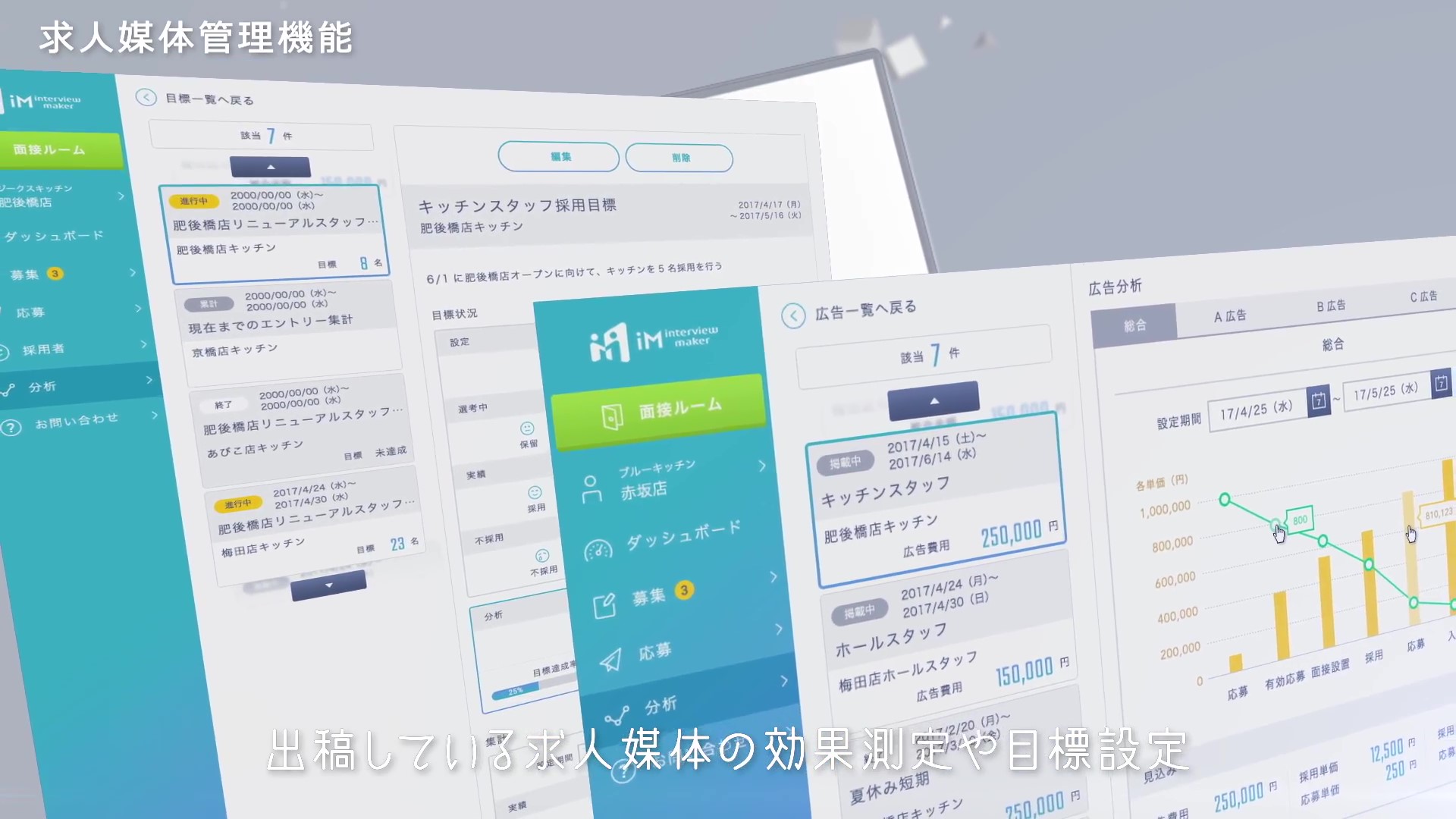 パソコン・スマホでいつでもどこでも採用面接が行えるクラウド型採用管理ツールの商品紹介映像を制作しました。CGを交えつつキャッチーに商品の魅力が訴求できるよう、世界観をシンプルに統一させました。