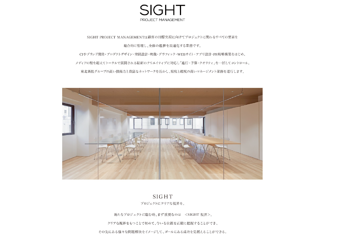 SIGHT PROJECT MANAGEMENTは顧客の目標実現に向けてプロジェクトに関わるすべての要素を総合的に管理し、全体の進捗を最適化する業務です。CIやブランド開発・プロダクトデザイン・空間設計・映像・グラフィック・WEBサイト・アプリ設計・PR戦略構築をはじめ、メディアの壁を超えてトータルで展開される最新のクリエイティブに対応し「進行×予算×クオリティ」を一括してコントロール。東北新社グループの高い技術力と豊富なネットワークを活かし、精度と確度の高いマネージメント業務を遂行します。こちらのサイトのシステムを担当しました。
